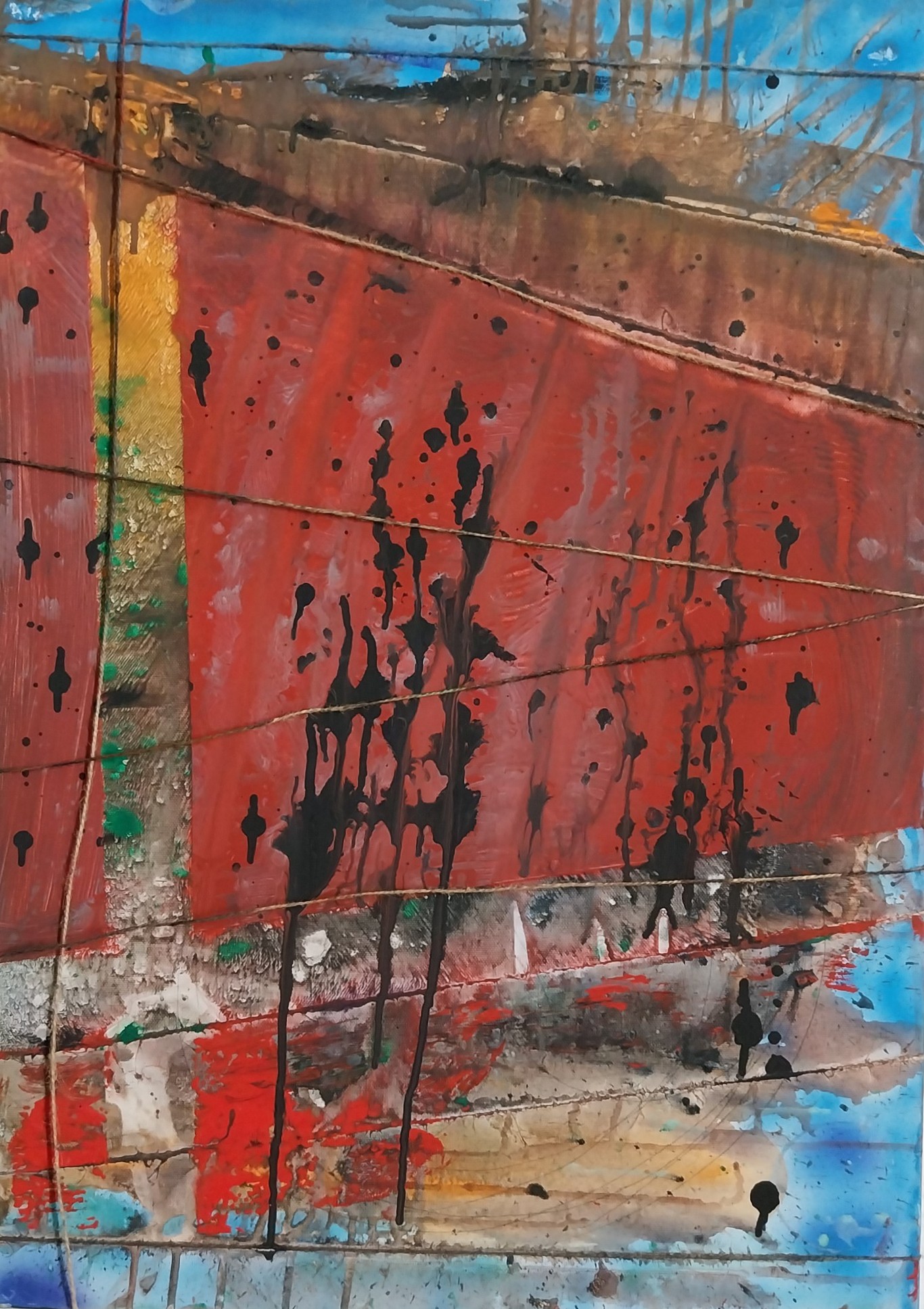 - Das Abstrakte Gemälde (Bild 2): Rote, rostige Textur, dunkle Spritzer, gespannte Fäden.